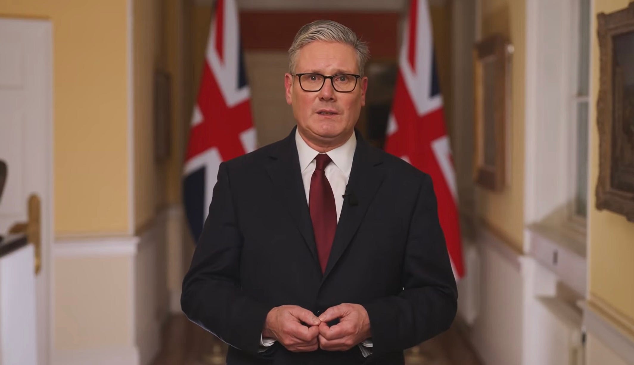 Gjennom hele talen holder Starmer begge hendene foran seg og former to perfekte O-er ved å la tommel og pekefinger møtes, som om han forsøker å regulere angsten. Samtidig staver han seg langsomt – altfor langsomt – gjennom budskapet, uten å forandre en mine.
