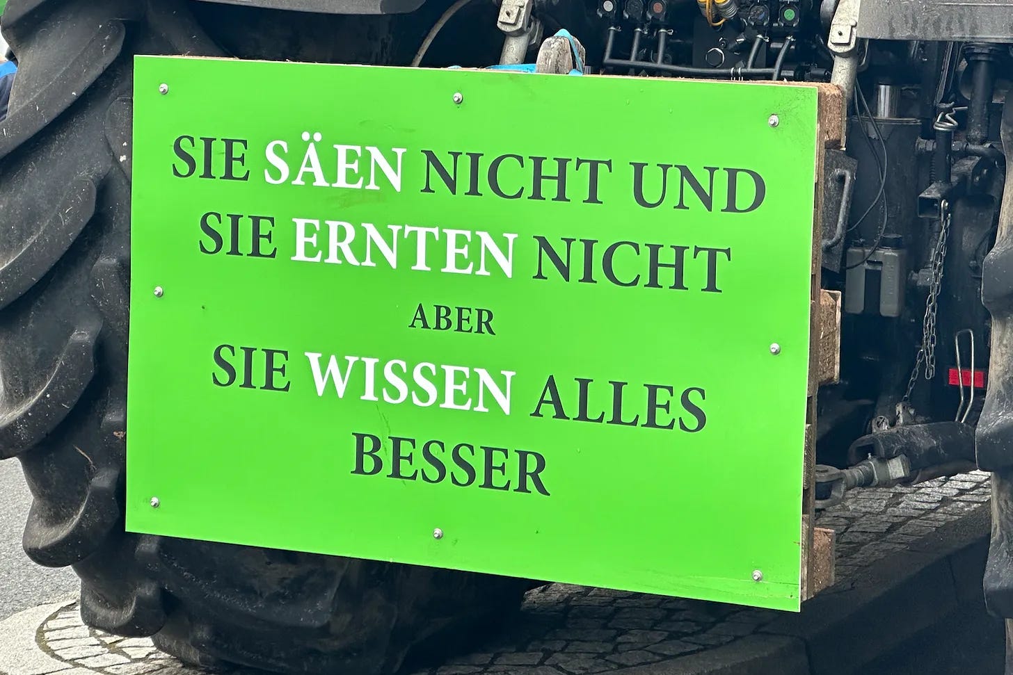 Det synes å sammenfatte stemningen vel. Og det er ikke lenger bare bønder å finne ute på gatene. Bondeopprøret har spredt seg til andre deler av den tyske Mittelstand, som for eksempel uavhengige lastebilsjåfører, speditører, bakere og slaktere, som også ser sitt levebrød truet av overregulering og økonomisk skvis. Parolen som kan høres i alle byer fra Hamburg til Munchen er, Wir haben die Schnause voll - nok er nok - eller direkteoversatt, Vi har snuta full.