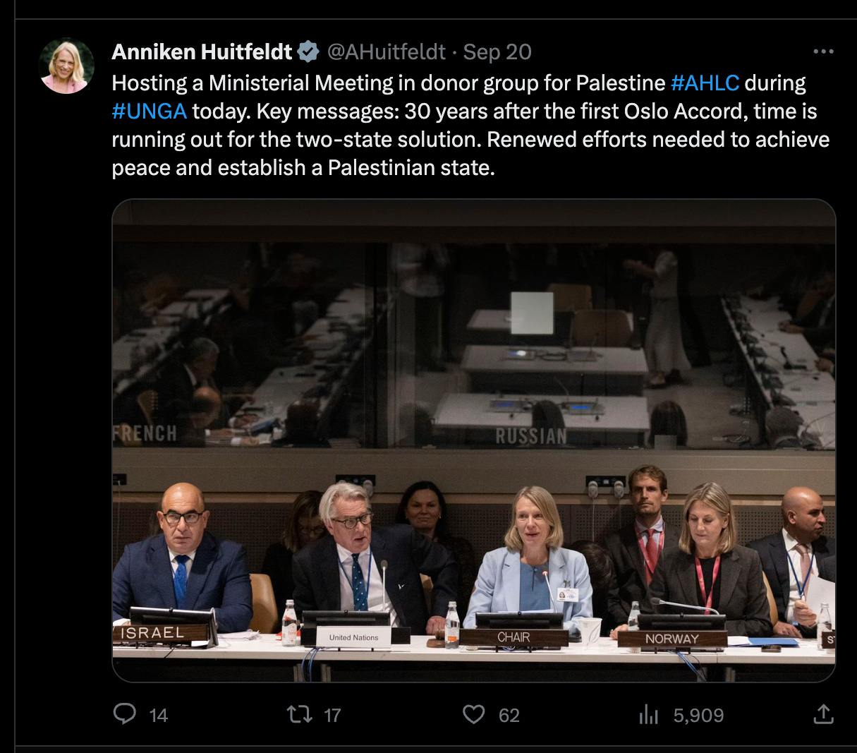 To-stat-løsningen er selve symbolet på denne misforståtte politikken. Diplomat Anniken Huitfeldt var i Midtøsten bare uker før 7. oktober, for med sammenbitte tenner å fortsette de evigvarende forhandlingene om denne kimære løsningen. I det minste skaper det arbeidsplasser blant hennes venninner i det norske humanitær-industri-komplekset.