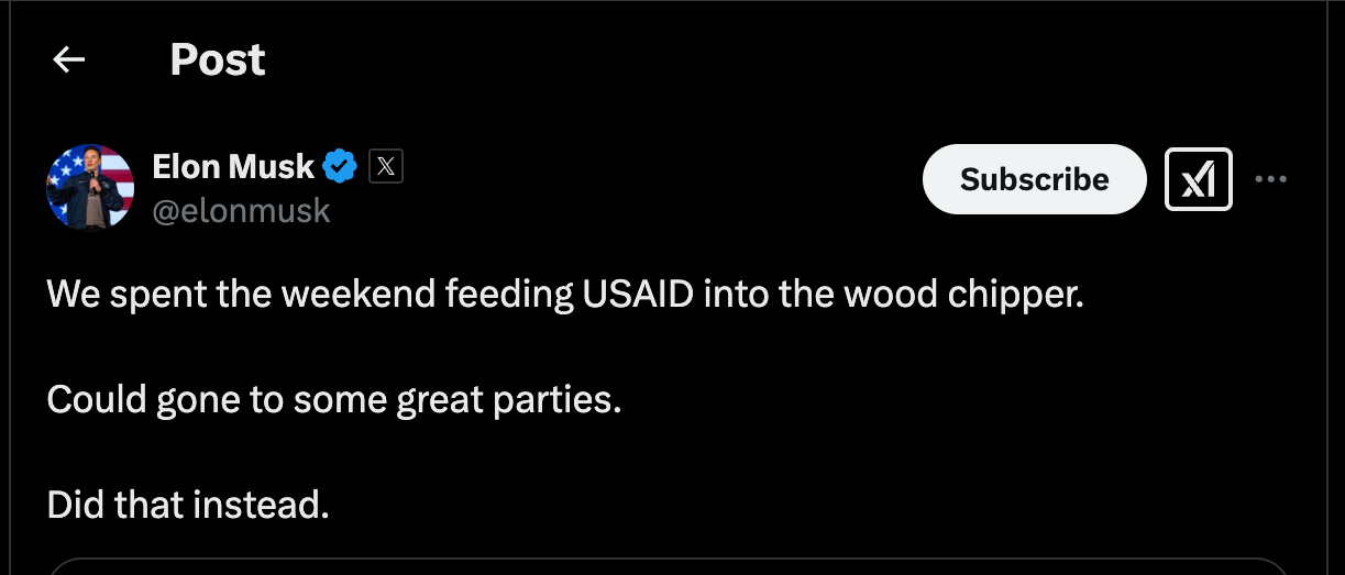 Elon Musk på sin side sendte ut en ironisk tweet om at USAID har et budsjett på 40 milliarder dollar, finansiert av amerikanske skattebetalere, men at pengene sendes utenlands.