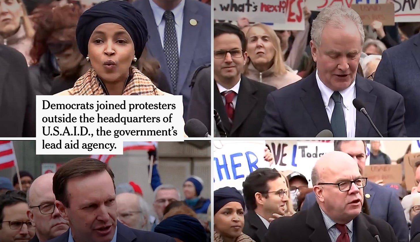 Mandag 3. februar sluttet prominente demokrater seg til de over hundre USAID-ansatte som protesterte foran Ronald Reagan-bygget i Washington, D.C., etter at de ble nektet adgang av Elon Musks DOGE-agenter. Blant lovgiverne foran bygget var flere av de mest fremtredende Trump-haterne i den imperiale hovedstaden.