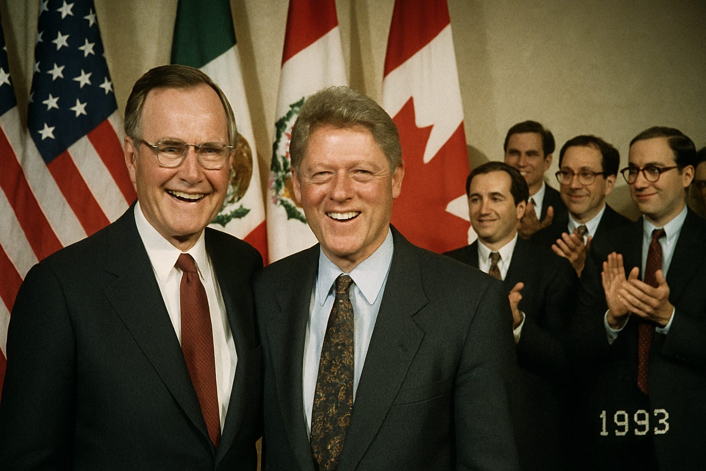 To år etter talen, i 1993, ble det første steget mot det «verdenssamfunnet» George H.W. Bush hadde forespeilet amerikanerne tatt av Bushs etterfølger i Det ovale kontor, guvernør Bill Clinton (Bubba), en demokrat. Gulrøttene kom i form av NAFTA-frihandelsavtalen, som åpnet grensene i nord og sør på vidt gap for ubegrenset flyt av varer og tjenester mellom USA, Mexico og Canada.