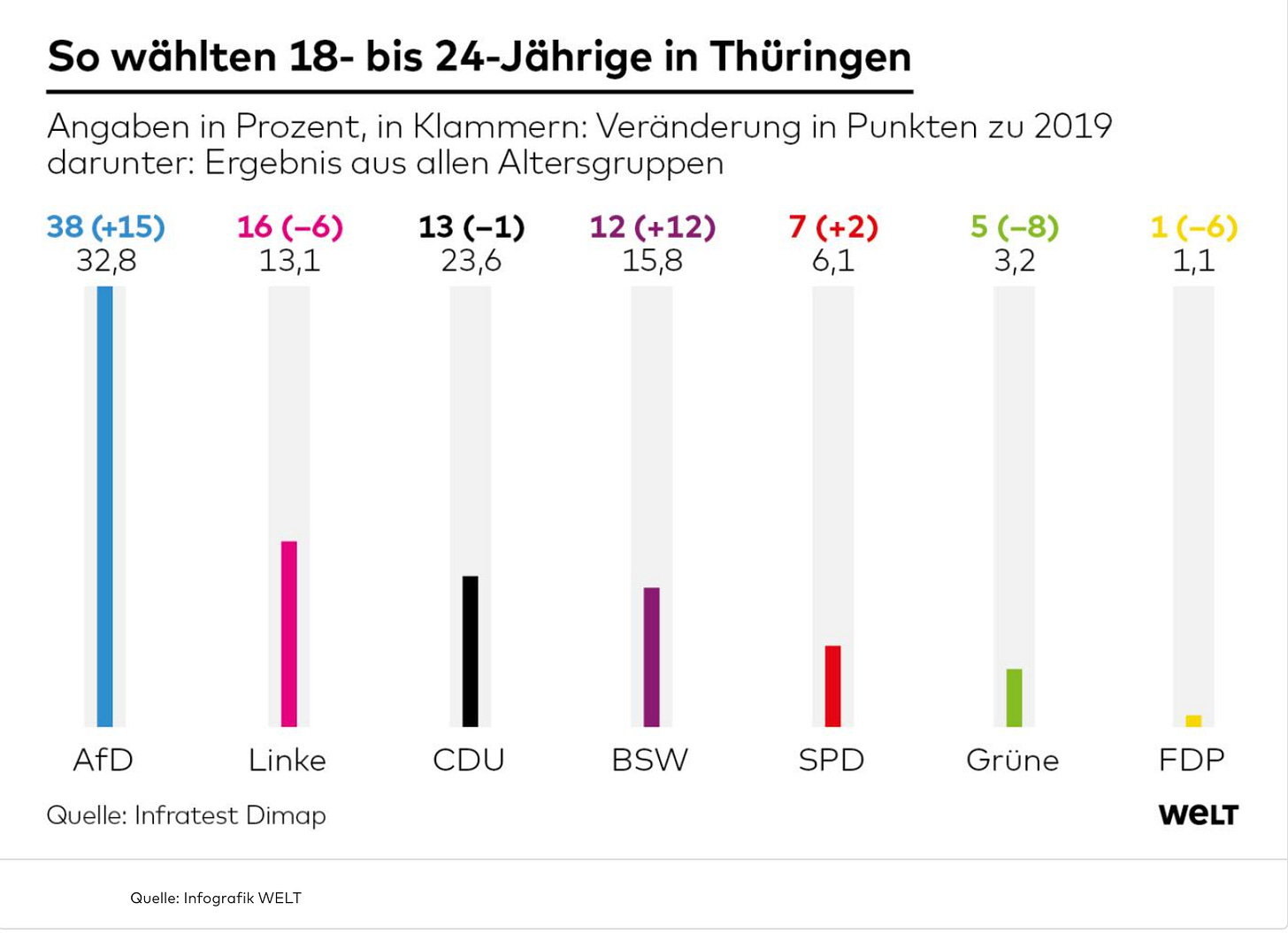Unge mennesker stemte i overveldende nummer for AfD. Blandt 18-24 åringer i Thuringen, ligger støtten for AfD på 38%. Mot forventningene til woke-venstre, men bare logisk når man tenker på, at de må være på rene med, at de er i ferd med å arve en rykende ruin, for å låne et utrykk.