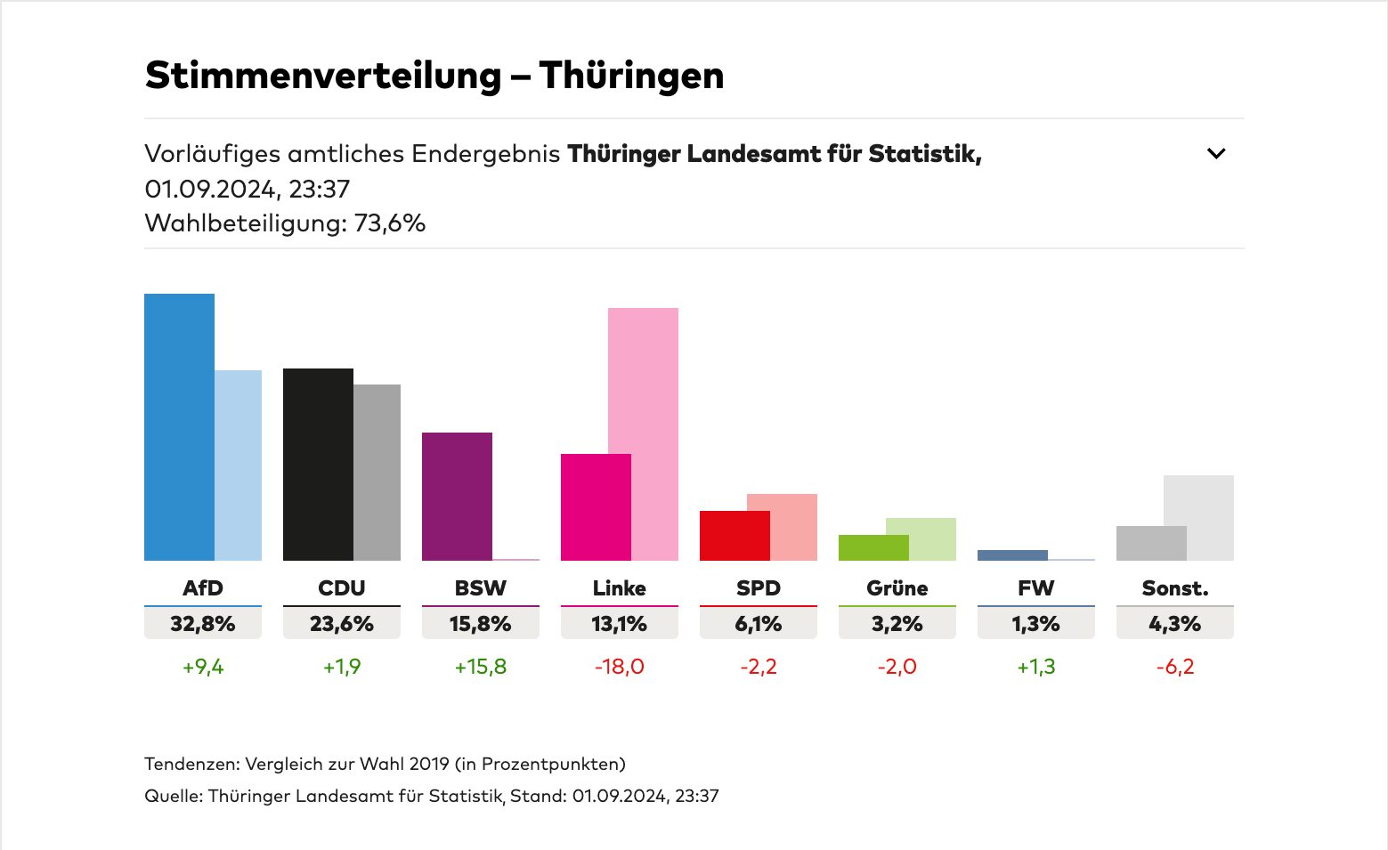 I Thüringen, hvor AfD blir ledet av Bjørn Høcke, blir partiet det største i delstatsforsamlingen, etter å ha halt inn 32.8% av stemmene, mot nest største CDU, med 23.6%.