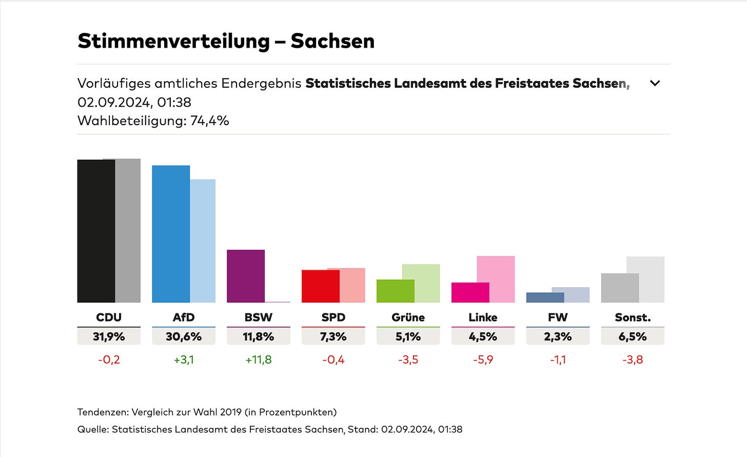 I Sachsen blir AfD nest størst med 30.6%, mot CDUs 31.9%.
